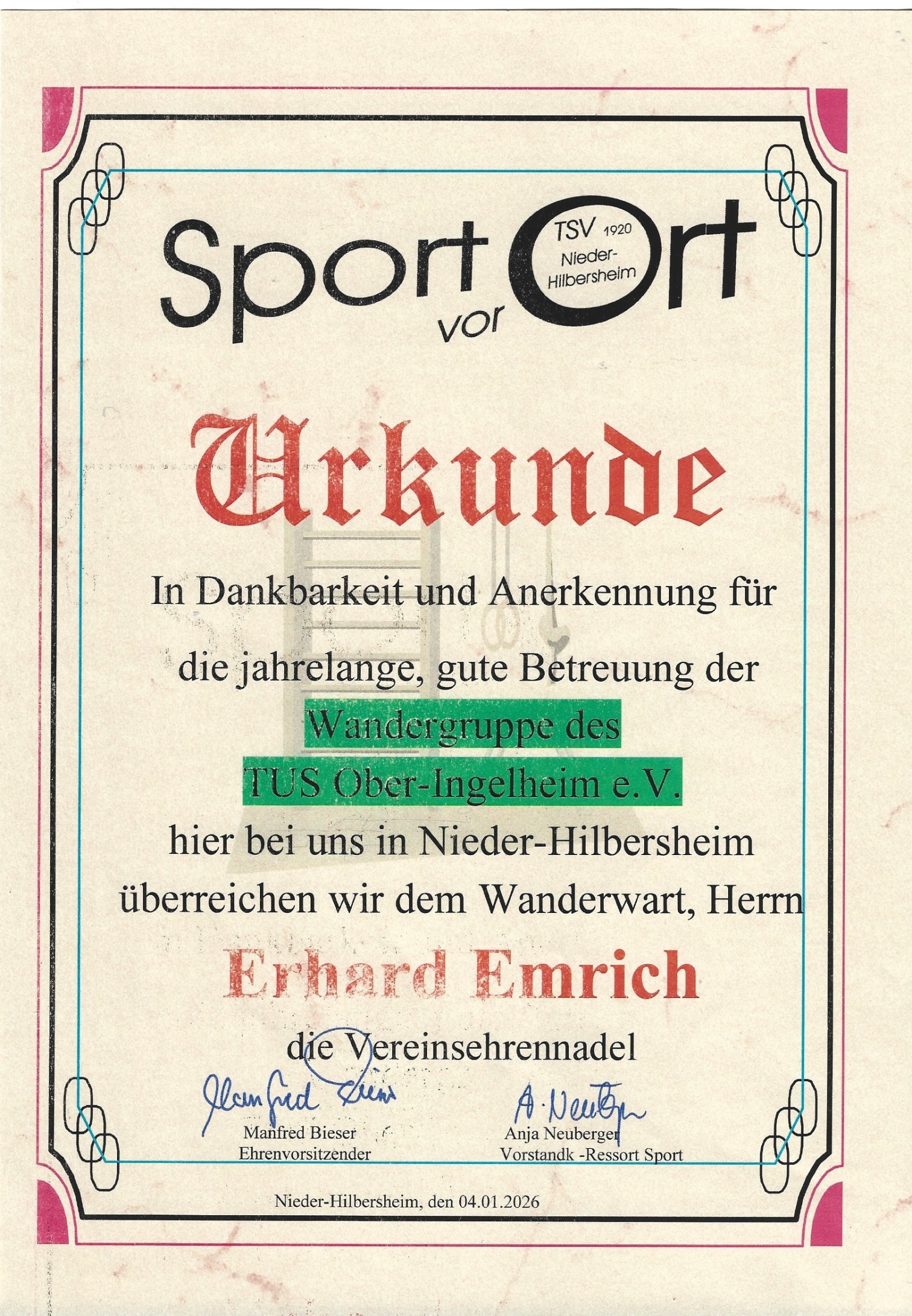 Der Ehrenvorsitzende der TSV, Manfred Bieser, zeichnete die Wandergruppe der TuS Ober-Ingelheim und den Wanderwart Erhard Emrich mit einer Urkunde aus.